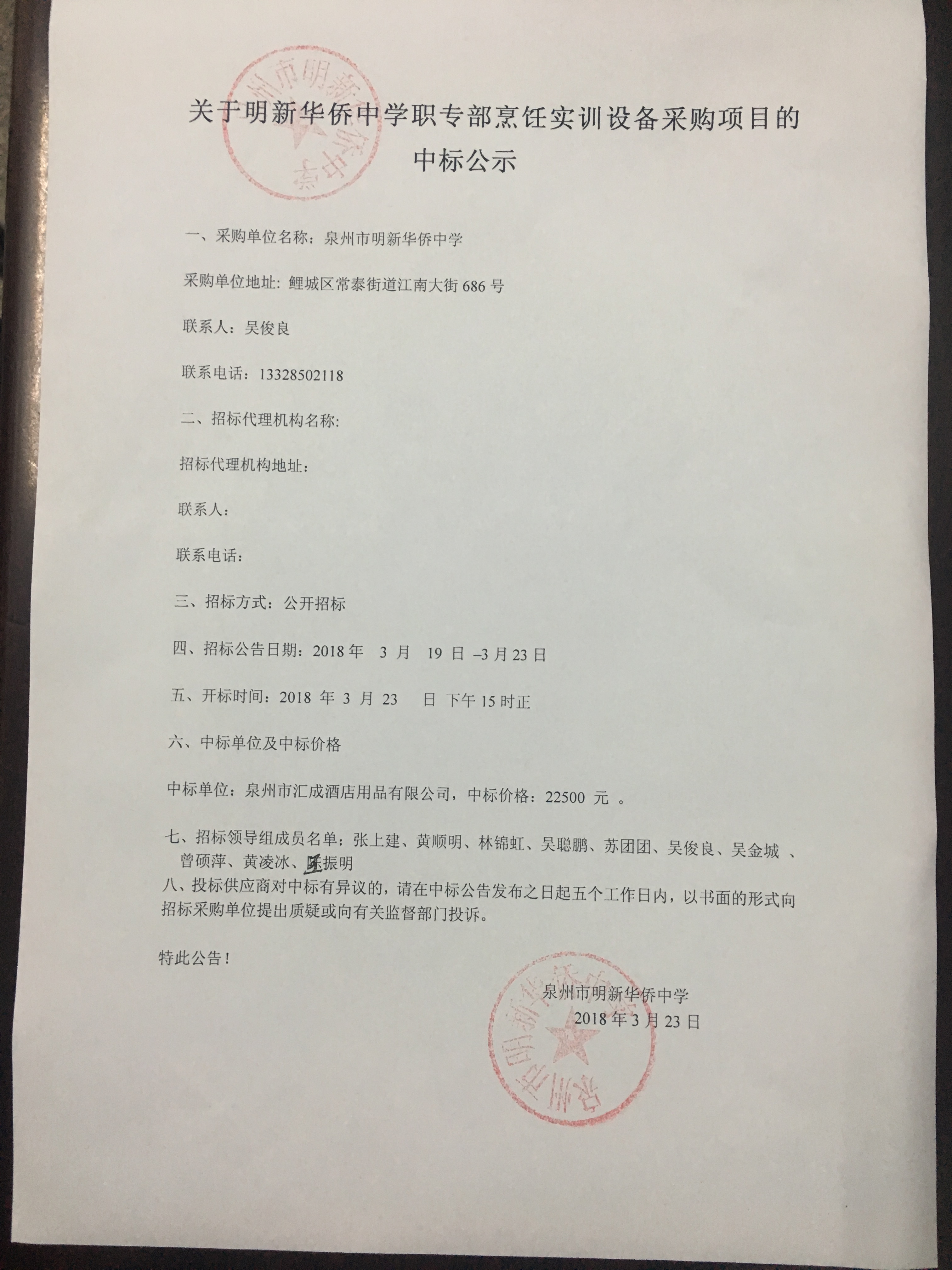 關于明(míng)新華僑中學職專部烹饪實訓設備采購(gòu)項目的(de)中标公示