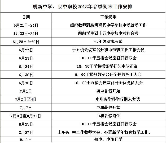 根據泉鯉政教〔2018〕05号《泉州市(shì)鯉城(chéng)區(qū)教育局關于鯉城(chéng)區(qū)普通(tōng)中學、中等職校(xiào)2017—2018學年(nián)第一(yī)學期期末及寒假工(gōng)作(zuò)意見(jiàn)》文(wén)件(jiàn)要(yào)求,并結合我校(x÷iào)實際工(gōng)作(zuò)情況,2017年(nián)秋季期末暨2018年(nián)春季期初工(gōng)作(zuò)安排見(jiàn)附件(jiàn)。