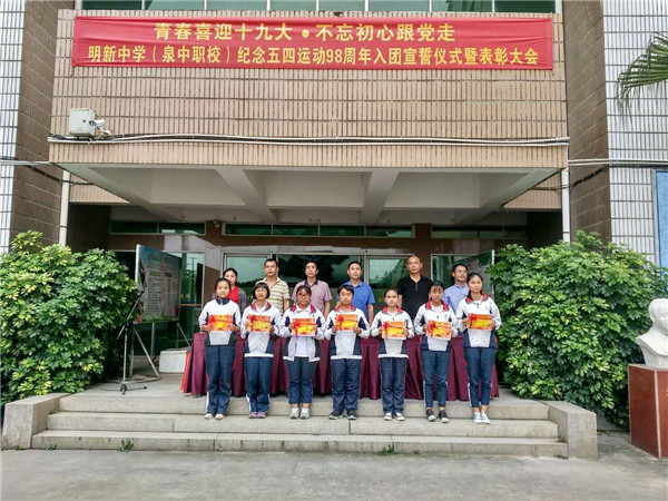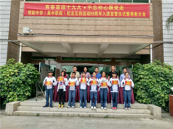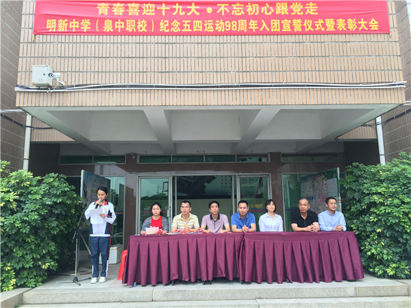 為(wèi)紀念五四運動98周年(nián)暨中國(guó)共産主義青年(nián)團成立95周年(nián),弘揚“愛(ài)國(guó)、進步、民(mín)主、科(kē)學”的(de)五四精神,5月(yuè)3日(rì)下(xià)午,明(míng)新中學(泉中職校(xiào))舉行(xíng)2017年(nián)新團員(yuán)入團宣誓儀式暨表彰大(dà)會(huì)。張上(shàng)建校(xiào)長(cháng)、黃(hu↓áng)順明(míng)書(shū)記及各處室領導出席了(le)本次會(huì)議(yì)。大(dà)會(huì)由團委書(shū)記↔郭婷婷主持。