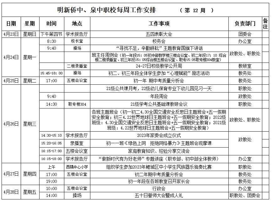 【04月(yuè)24日(rì) 星期一(yī)】 2023年(nián)春季第12周工(gōng)作(zuò)安排