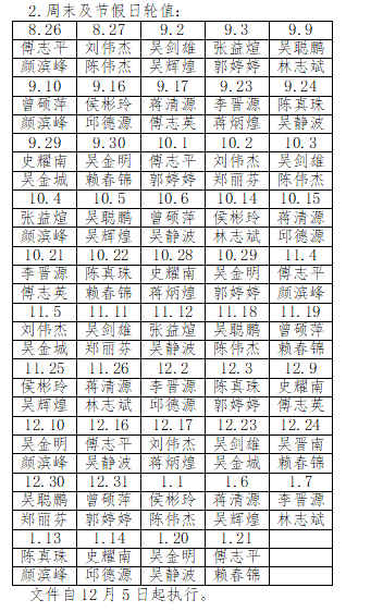 因人(rén)事(shì)變動,經學校(xiào)行(xíng)政會(huì)研究決定,2023年(nián)秋季學期行(xíng)政人(rén)員(yuán)值班安排調整如(rú)下(xià):