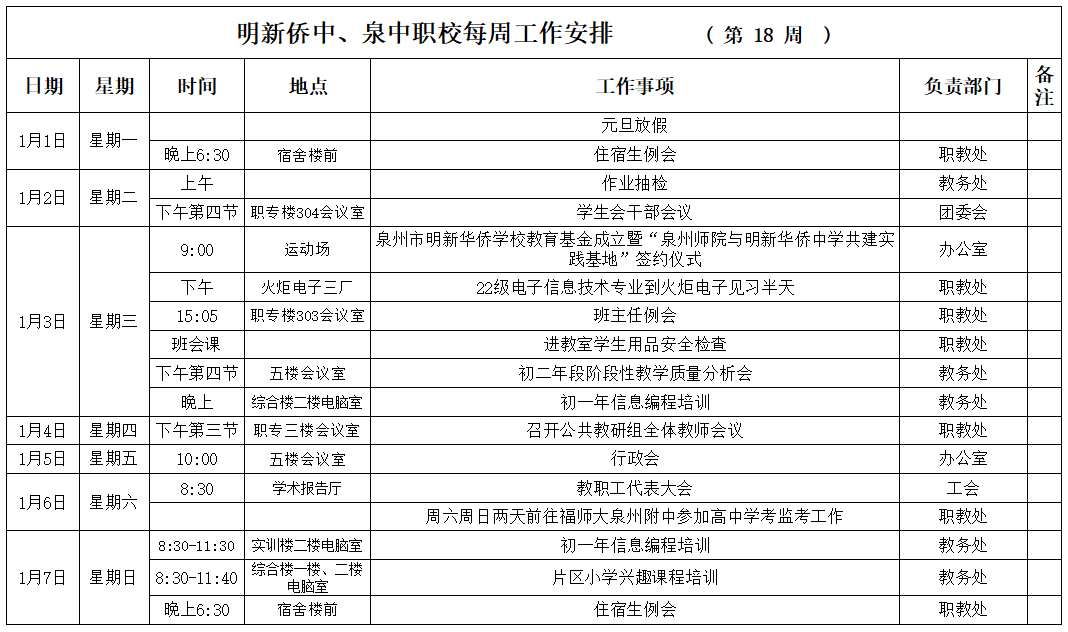 【1月(yuè)01日(rì) 星期一(yī)】 2024年(nián)秋季第18周工(gōng)作(zuò)安排