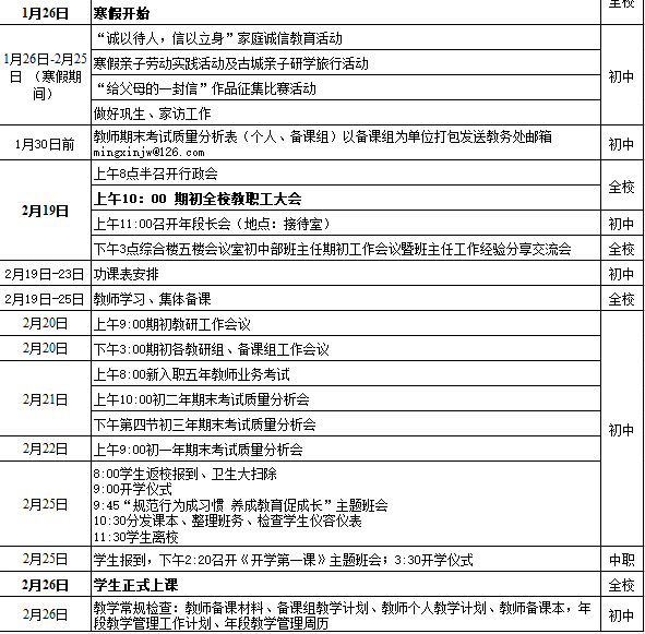 根據泉教辦〔2023〕13号《關于2023-2024學年(nián)度普通(tōng)中小(xiǎo)學、幼兒(ér)園、中等職業(≥yè)學校(xiào)校(xiào)曆時(shí)間(jiān)安排的(de)通(tōng)知(zhī)》文(™wén)件(jiàn)要(yào)求,并結合我校(xiào)實際工(gōng)作(zuò)情況,制(zhì)定了(le)2023年(nián)秋季期末暨2024年(nián)春季期初工(gō♥ng)作(zuò)安排,詳見(jiàn)附件(jiàn),請(qǐng)遵照(zhào)執行(xíng),若因工(gōng)作(zuò)需要(yào)或上(shàng)級要(yào)求有(yǒu)所變動将另行(xín↓g)通(tōng)知(zhī)。