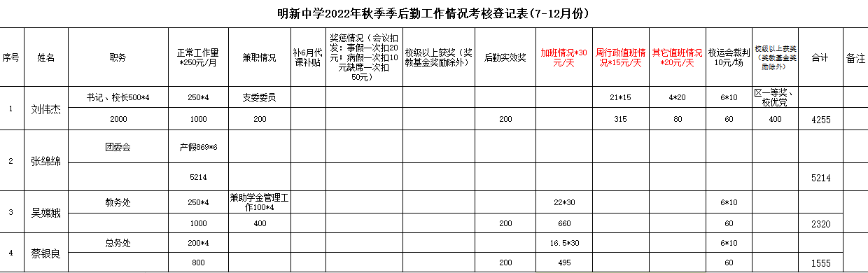 明(míng)新中學2022年(nián)秋季季後勤工(gōng)作(zuò)情況考核登記表(7-12月(yuè)份)