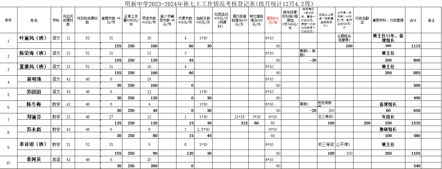 明(míng)新中學2023-2024年(nián)秋七上(shàng)工(gōng)作(zuò)情況考核登記表(按月(yuè)統計(jì)12月(yuè)4.2周)