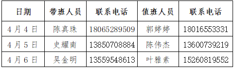 根據國(guó)務院辦公廳節假日(rì)休假規定,今年(nián)我校(xiào)清明(míng)節放(fàng)假時(sh§í)間(jiān)為(wèi)4月(yuè)4日(rì)至6日(rì),4月(yuè)7日(rì)正常上(shàng)課,補周五課程。請(qǐng)各年(nián)段長(cháng)、各專業(yè)組長(cháng)根據文↓(wén)件(jiàn)在放(fàng)假之前加強對(duì)學生(shēng)的(de)安全教育,并請(qǐng)值班人(rén)員(yuán)做(zuò§)好(hǎo)值班工(gōng)作(zuò)。放(fàng)假期間(jiān)值班工(gōng)作(zuò)安排如(rú)下(xià):
