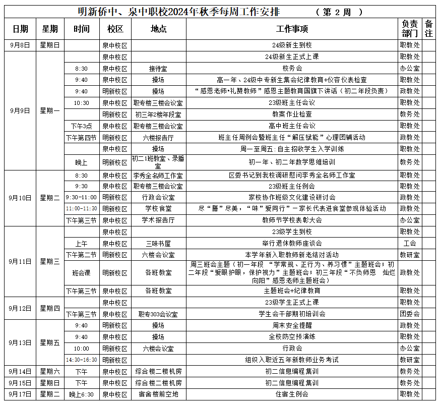 【09月(yuè)09日(rì) 星期一(yī)】 2024年(nián)秋季第2周工(gōng)作(zuò)安排