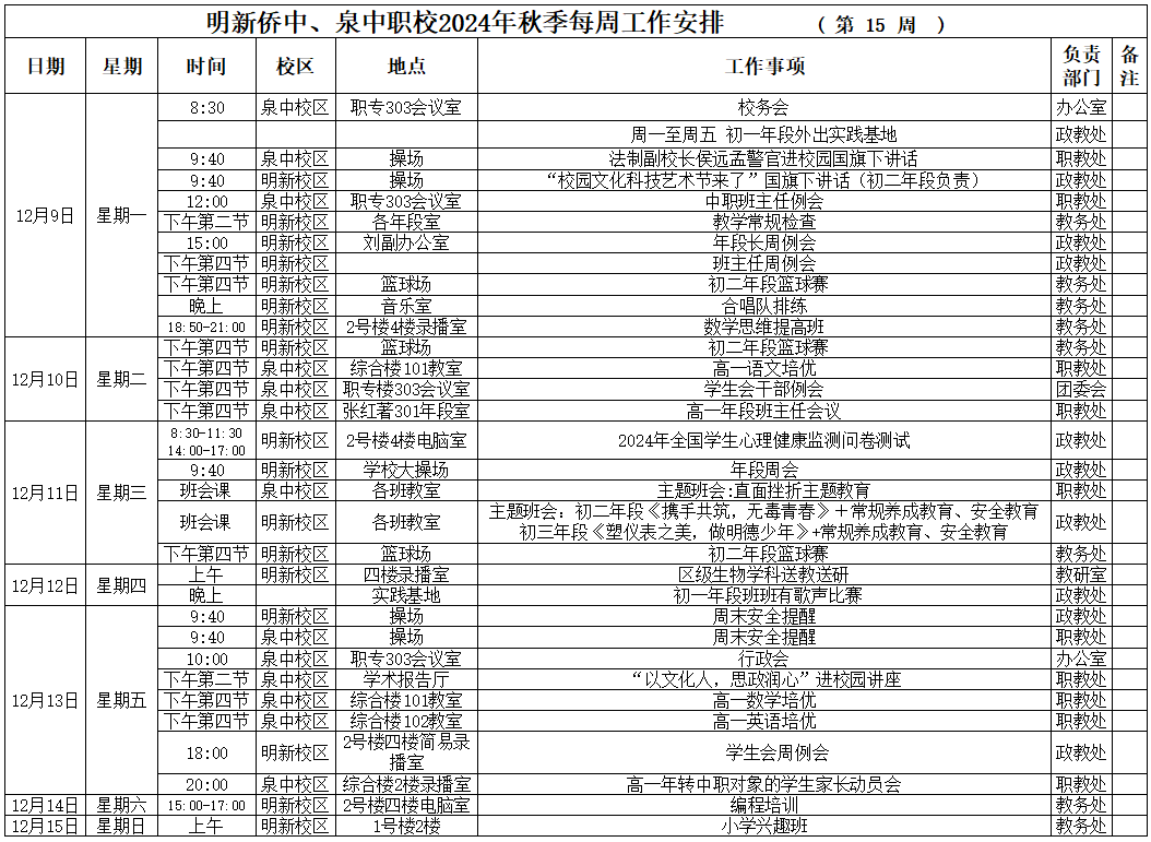 【12月(yuè)09日(rì) 星期一(yī)】 2024年(nián)秋季第15周工(gōng)作(zuò)安排