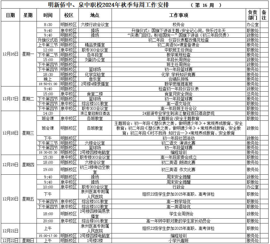 【12月(yuè)16日(rì) 星期一(yī)】 2024年(nián)秋季第16周工(gōng)作(zuò)安排