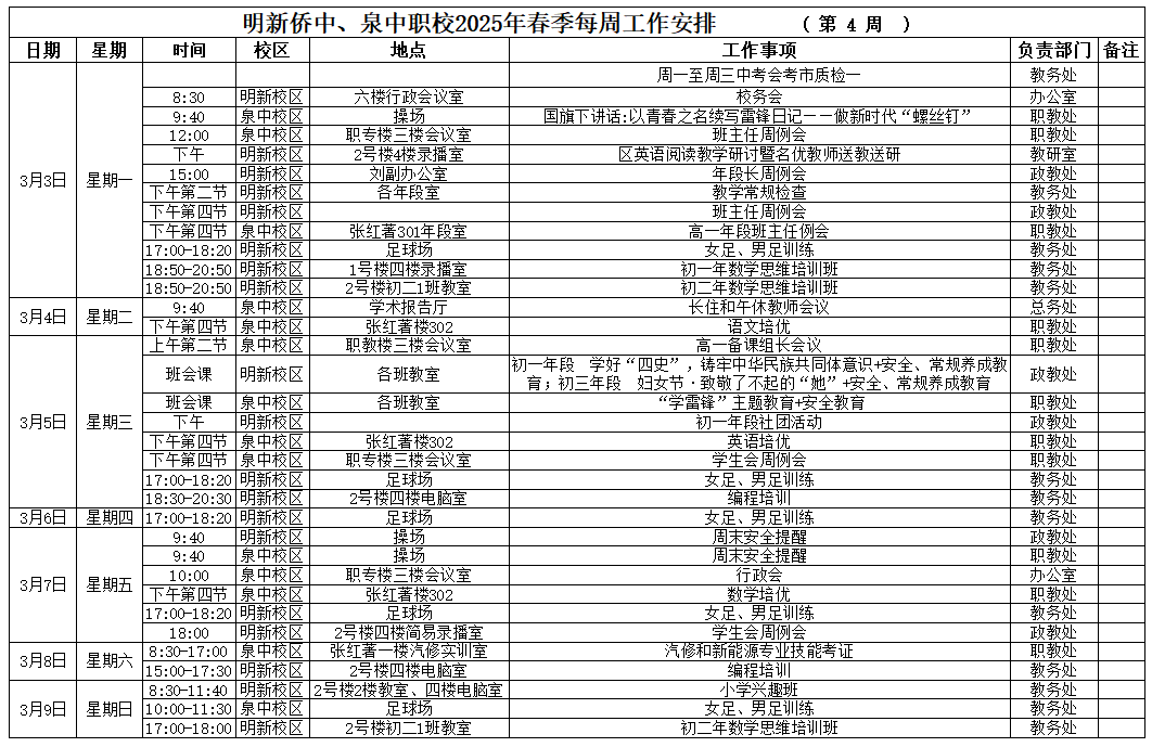 【03月(yuè)03日(rì) 星期一(yī)】 2025年(nián)春季第4周工(gōng)作(zuò)安排