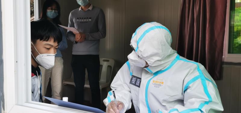 返校(xiào)當天,學生(shēng)由家(jiā)長(cháng)送至學校(xiào),前後間(jiān)隔一(yī)米,有(yǒu)序經過入校(♥xiào)專用(yòng)通(tōng)道(dào),經體(tǐ)溫測量,體(tǐ)溫正常者延制(zhì)定線路(lù)指引進入班級,接受班主任晨午檢。發現(xiàn)一(yī)名學生(s✔hēng)體(tǐ)溫異常,值班行(xíng)政當即将其帶至校(xiào)門(mén)口臨時(shí)隔離(lí)點,校(xiào)醫(yī)用(yòng)水(shuǐ)銀(yín)體(tǐ) 溫計(jì)二次測量體(tǐ)溫,詢問(wèn)無流行(xíng)病學史,值班行(xíng)政向帶班領導彙報(bào)情況,按應急處置指南(nán)指引,班主任通(tōng)知(zh→ī)家(jiā)長(cháng)到(dào)校(xiào)接至市(shì)醫(yī)院發熱(rè)門(mén)診就(jiù)診,消毒人(rén)員(yuán)到(dào)相(xiàng)關區(qū€)域進行(xíng)消殺,持續跟蹤學生(shēng)後續情況。