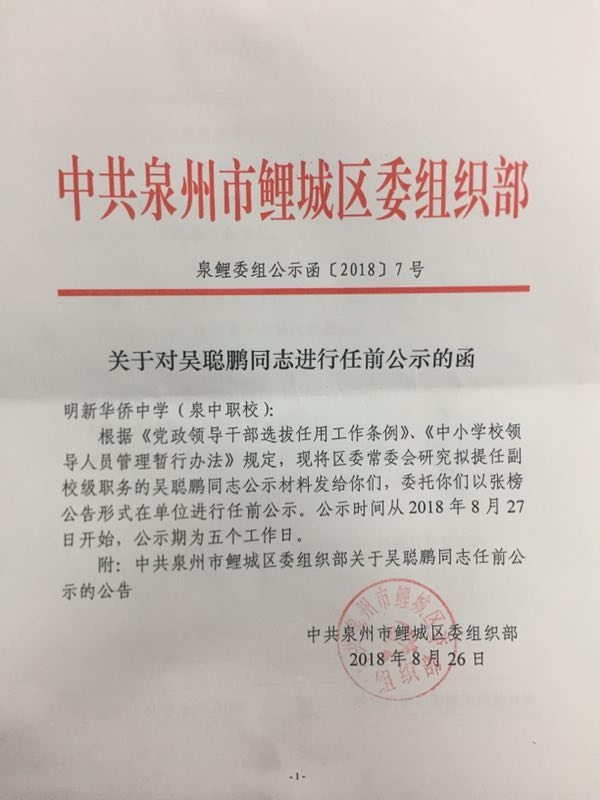 中共鯉城(chéng)區(qū)委組織部關于吳聰鵬同志(zhì)任前公示的(de)公告
