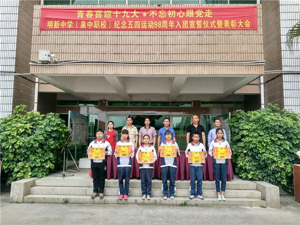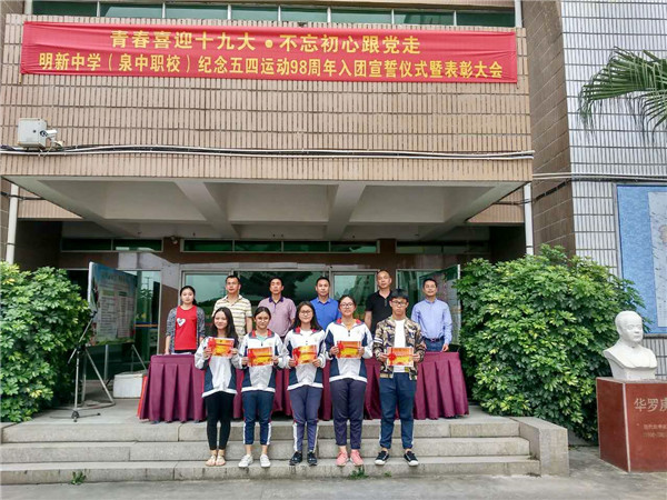為(wèi)紀念五四運動98周年(nián)暨中國(guó)共産主義青年(nián)團成立95周年(nián),弘揚“愛(ài)國(guó)、進步、民(mín)主、科(kē)學”的(de)五四精神,5月(yuè)3日(rì)下(xià)午,明(míng)新中學(泉中職校(xiào))舉行(xíng)2017年(nián)新團員(yuán)入團宣誓儀式暨表彰大(dà)會(huì)。張上(shàng)建校(xiào)長(cháng)、黃(hu↓áng)順明(míng)書(shū)記及各處室領導出席了(le)本次會(huì)議(yì)。大(dà)會(huì)由團委書(shū)記↔郭婷婷主持。