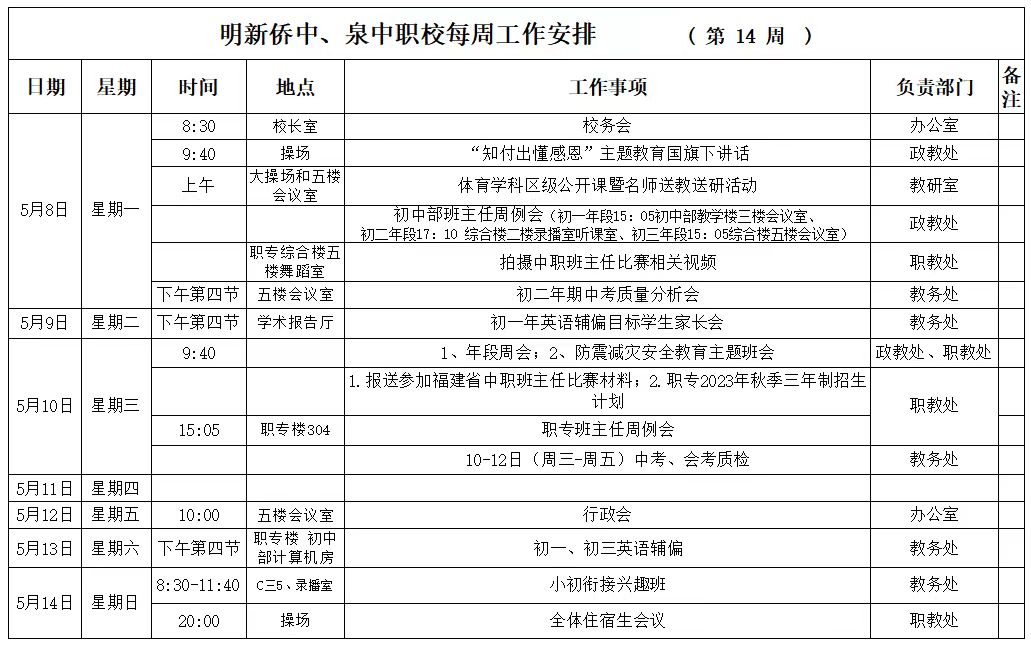 【05月(yuè)08日(rì) 星期一(yī)】 2023年(nián)春季第14周工(gōng)作(zuò)安排