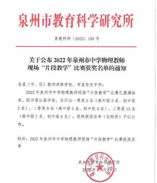 在剛剛結束的(de)2022年(nián)泉州市(shì)中學物(wù)理(lǐ)教師(shī)現(xiàn)場(chǎng)“片段教學”比賽中,我校(xiào)青¥年(nián)教師(shī)黃(huáng)思敏憑借出色的(de)學科(kē)能(néng)力、紮實的(de)教學功底和(hé)飽滿的(de)教學熱(rè)情,在比賽中脫穎而出,榮獲一(yī•)等獎第一(yī)名。
