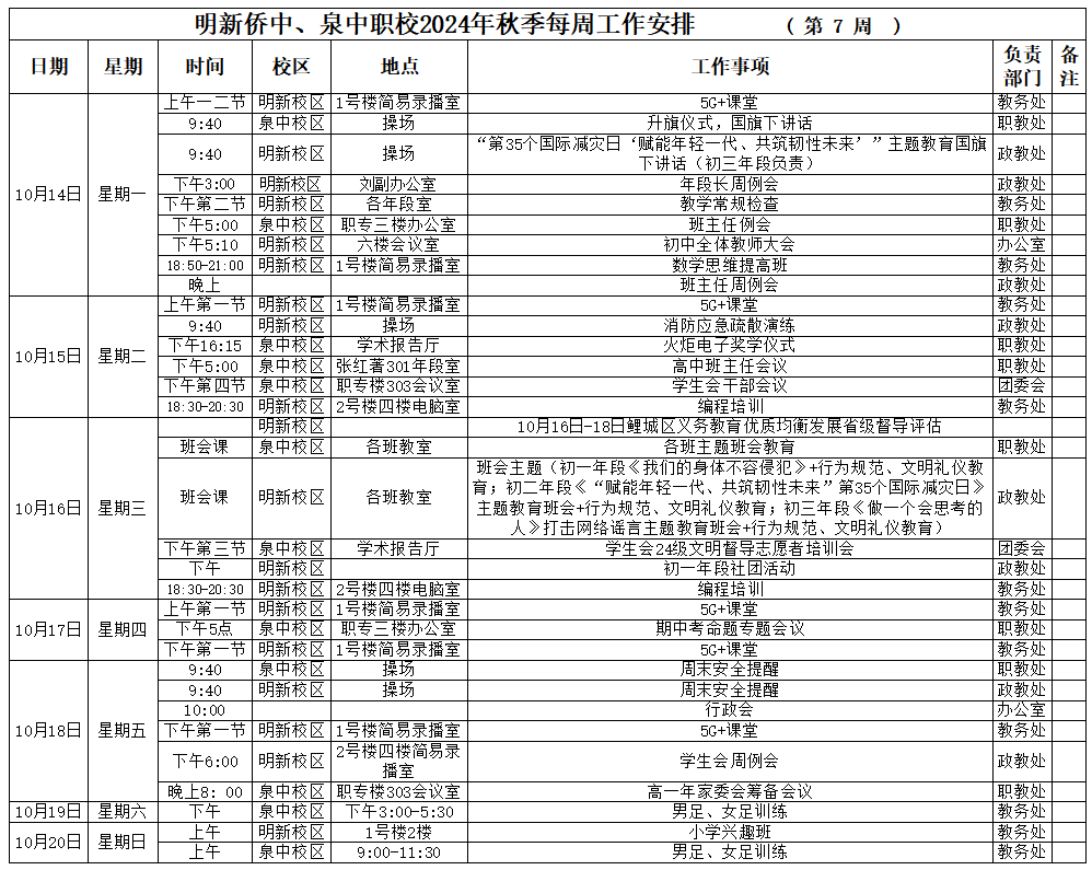【10月(yuè)14日(rì) 星期一(yī)】 2024年(nián)秋季第7周工(gōng)作(zuò)安排