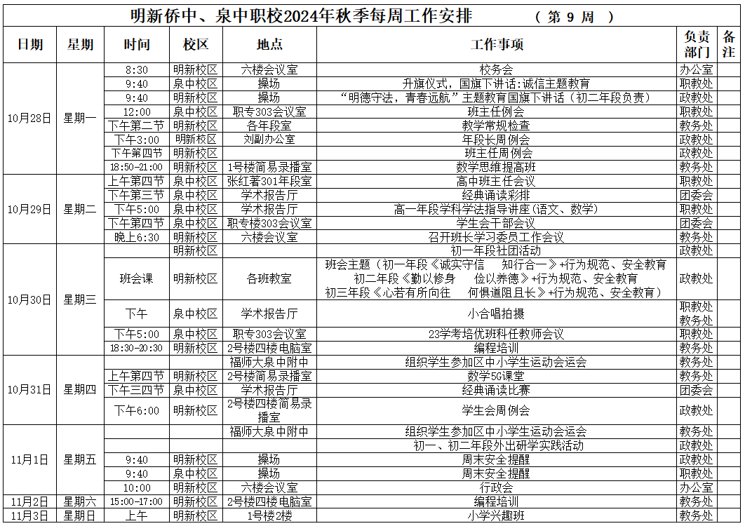 【10月(yuè)28日(rì) 星期一(yī)】 2024年(nián)秋季第9周工(gōng)作(zuò)安排