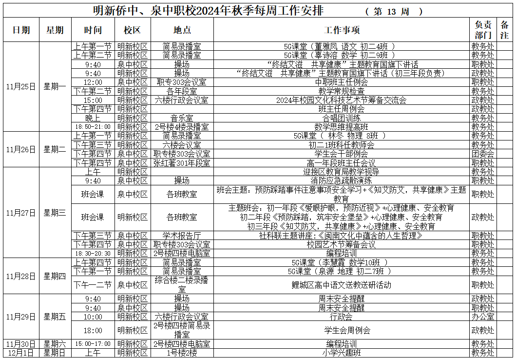 【12月(yuè)02日(rì) 星期一(yī)】 2024年(nián)秋季第14周工(gōng)作(zuò)安排