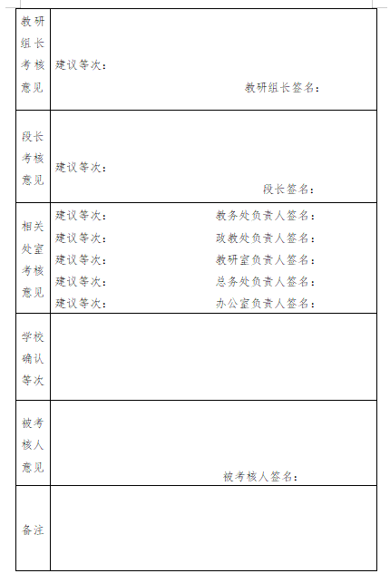 1.辦公室将考核表分(fēn)發給各教研組,由教研組長(cháng)組織本組被考核頂崗教師(shī),根據考核內(nèi)容,自(zì)我總結,填寫《考核登記表》。