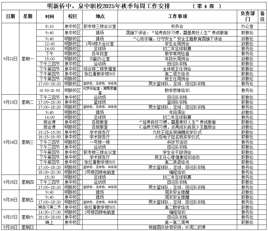 【09月(yuè)28日(rì) 星期日(rì)】 2025年(nián)秋季第05周工(gōng)作(zuò)安排